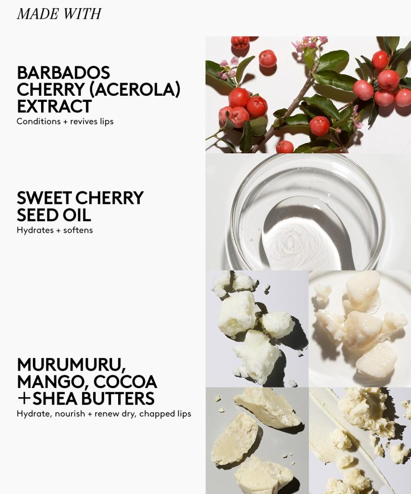 This juicy. Barbados Cherry-powered lip balm brings dry. chapped lips back to life with instant hydration. It’s mess-free and slips effortlessly into any pocket.
