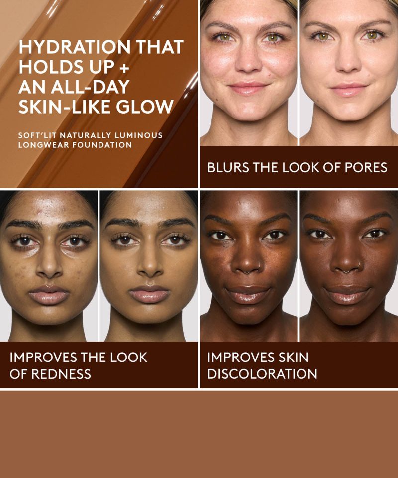 Step into your best light. A longwear. medium coverage foundation that gives golden hour glow all day long and stays fresh. It hydrates. brightens and improves skin tone both instantly and over time. while resisting sweat. humidity and transfer. This lightweight. waterpoof formula instantly reduces the appearance of shine and gives a whole new kind of radiance. This is just-right. notch-above-natural luminosity in a bottle.