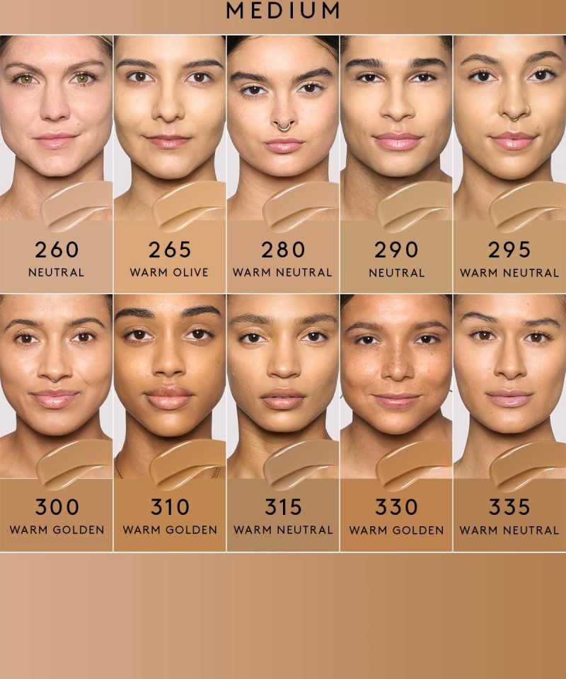 Step into your best light. A longwear. medium coverage foundation that gives golden hour glow all day long and stays fresh. It hydrates. brightens and improves skin tone both instantly and over time. while resisting sweat. humidity and transfer. This lightweight. waterpoof formula instantly reduces the appearance of shine and gives a whole new kind of radiance. This is just-right. notch-above-natural luminosity in a bottle.
